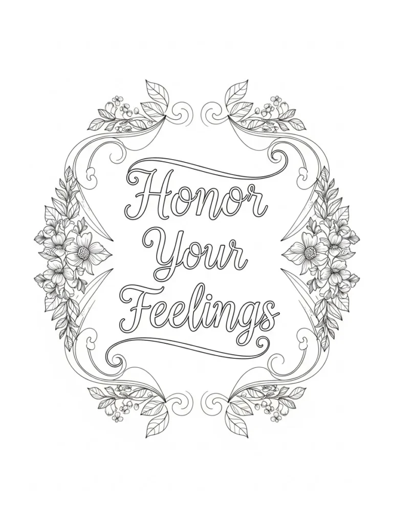 This adult coloring page features the quote Honor Your Feelings written in soft flowing script at the center, surrounded by an elegant floral frame. The design uses detailed line art with graceful swirls, leafy vines, and blooming flowers that feel balanced and symmetrical without looking stiff. The lines are clean and medium thin, giving plenty of room for careful shading while still feeling crisp and polished. Everything sits neatly on a white background, making the quote the clear focal point while the botanical details add a gentle decorative touch.