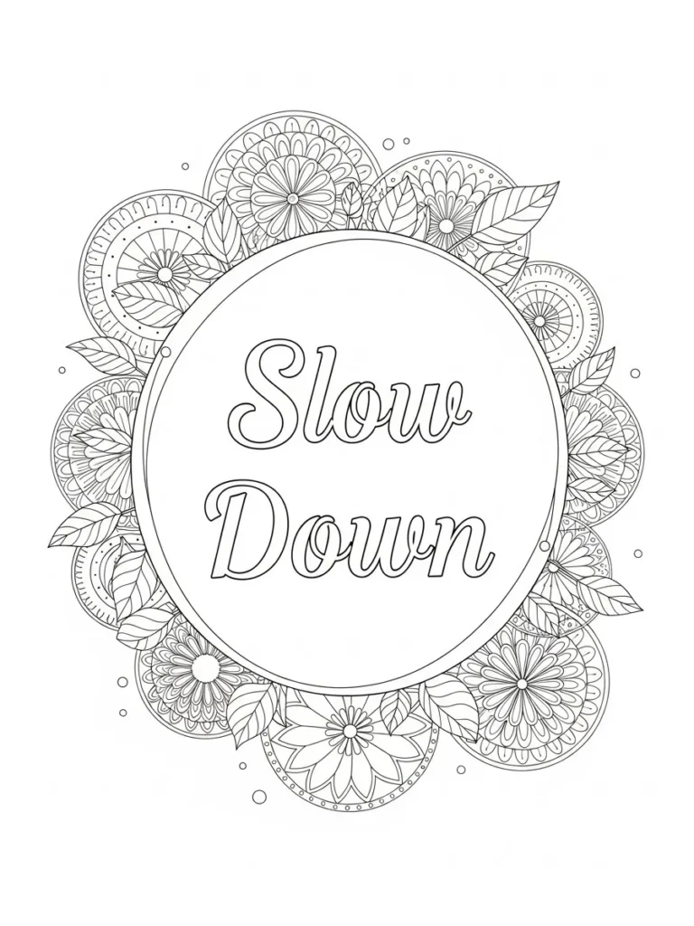 This adult coloring page features the calming words Slow Down placed at the center of a large circular frame, surrounded by layered floral mandala patterns and leafy details. The design feels beautifully balanced, with repeating petals, fine line textures, and soft dots creating depth around the circle. The line work is clean and medium thin, offering lots of small sections to color while keeping the quote area open and easy on the eyes. Everything flows outward in a gentle rhythm that feels steady and soothing.