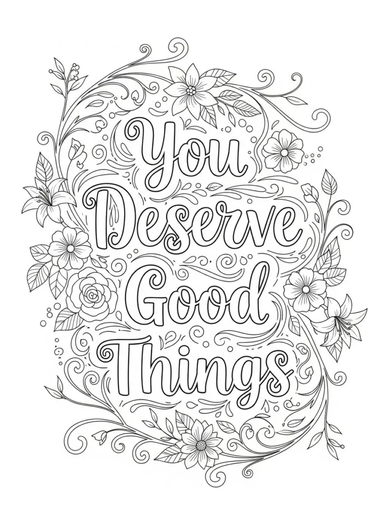 This adult coloring page features the uplifting message You Deserve Good Things in soft flowing hand lettering, surrounded by an abundance of flowers, leaves, and swirling decorative lines. The design feels full and expressive, with florals placed all around the quote to create a gentle frame that still feels open and inviting. The line work is clean and medium thin, offering lots of small details in the petals and curls while keeping the lettering clear and easy to color. Everything flows naturally around the words, giving the page a warm and encouraging feel.