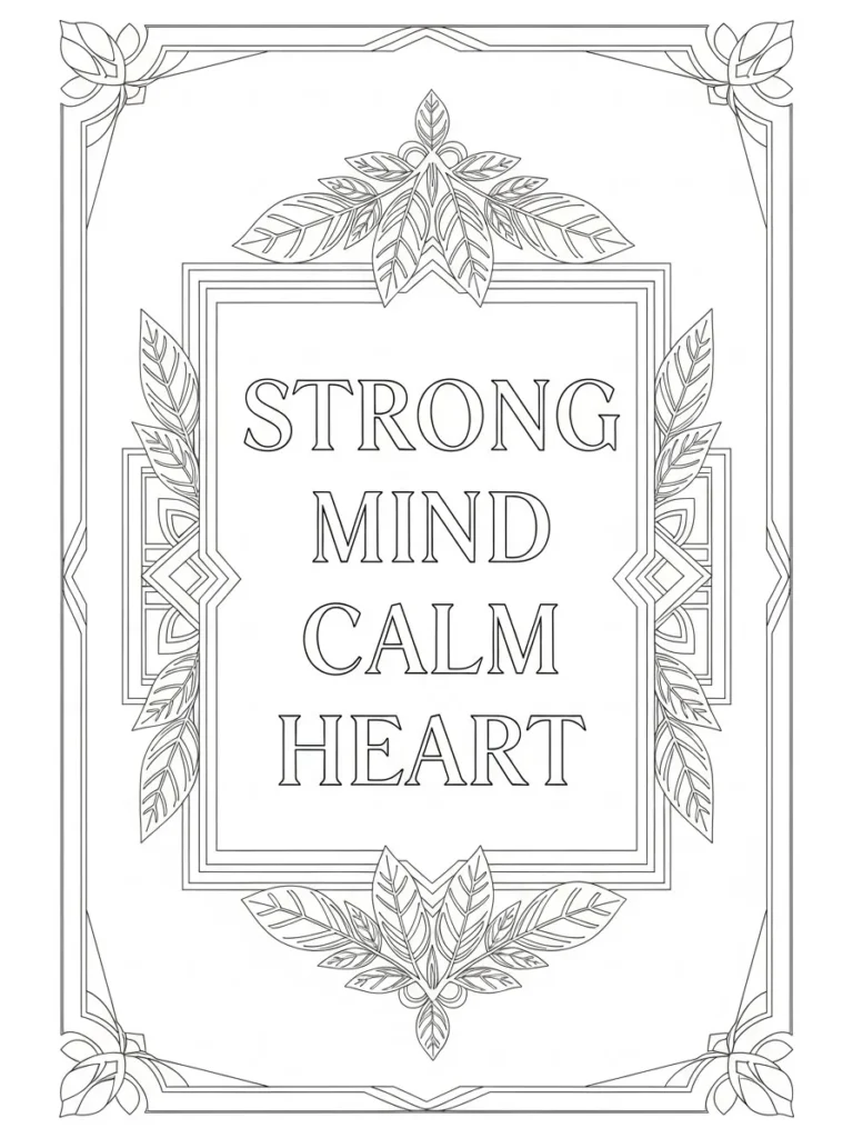 This adult coloring page features the centered affirmation Strong Mind Calm Heart set inside a clean geometric frame with layered borders and leafy accents at the corners. The design feels structured and refined, with symmetrical lines and repeating shapes that give it a calm balanced look. Delicate leaves soften the straight edges and add a gentle natural touch. The line work is clean and medium thin, making the frame satisfying to color while keeping the words clear and easy to focus on.