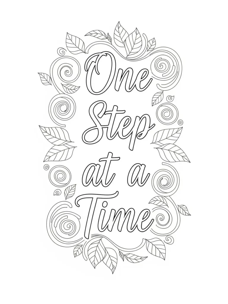 This adult coloring page features the encouraging phrase One Step at a Time written in smooth flowing script, framed by swirling lines and leafy accents that curve gently around the words. The design feels light and airy, with spiral details and leaves spaced evenly to create movement without clutter. The line work is clean and medium thin, giving plenty of room for soft shading while keeping the lettering clear and easy to color. The vertical layout guides your eye naturally down the page, reinforcing the calm steady message.
