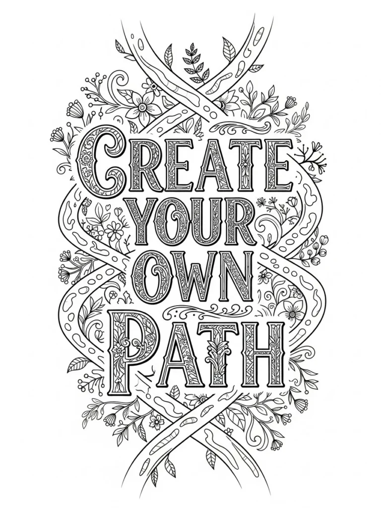 This adult coloring page features the empowering message Create Your Own Path in bold decorative lettering, woven through twisting branch like paths filled with leaves, flowers, and tiny botanical details. The layout feels vertical and flowing, with the words stacked confidently while the winding lines wrap around them like a journey unfolding. The line work is clean and medium thin, offering lots of intricate sections to color without feeling overwhelming. The mix of structured lettering and organic shapes gives the design a strong yet creative feel.
