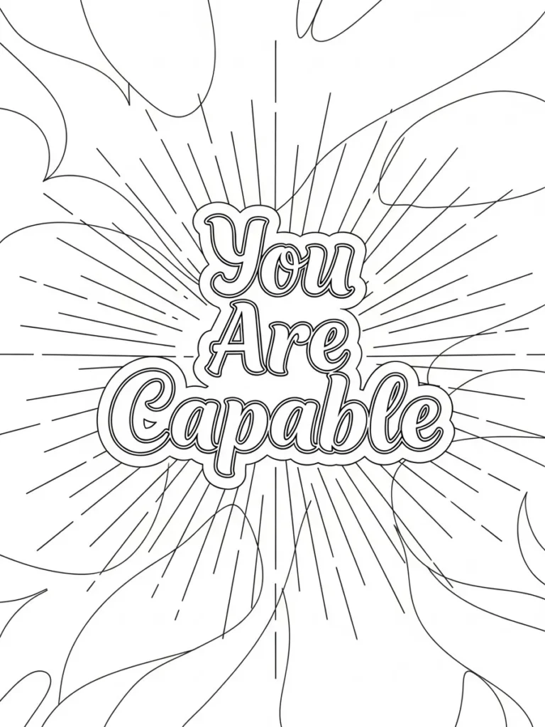 This adult coloring page features the empowering words You Are Capable in bold rounded lettering, placed at the center of a radiant burst design. Long straight rays extend outward in every direction, mixed with soft flowing abstract shapes that add movement and energy. The line work is clean and slightly thicker around the lettering, which helps the message stand out, while the surrounding rays and curves stay medium thin for easy coloring. The overall layout feels open and expansive, keeping the focus on the words while giving plenty of space to play with color.
