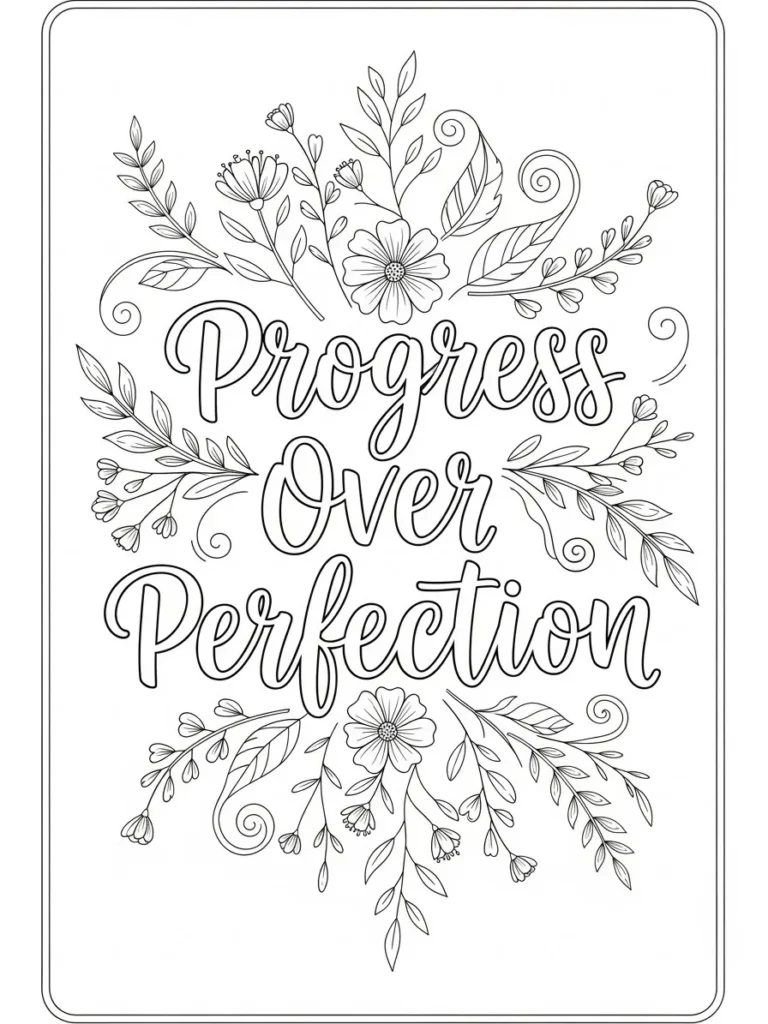 This adult coloring page features the encouraging phrase Progress Over Perfection written in soft flowing script and framed by delicate floral branches and leafy details. A simple rounded border surrounds the entire design, giving it a polished and finished look while keeping everything light and airy. The botanical elements are balanced on all sides, with small flowers, curved stems, and gentle swirls that add movement without feeling busy. The line thickness is medium thin throughout, making the details enjoyable to color while keeping the words easy to read and highlight.
