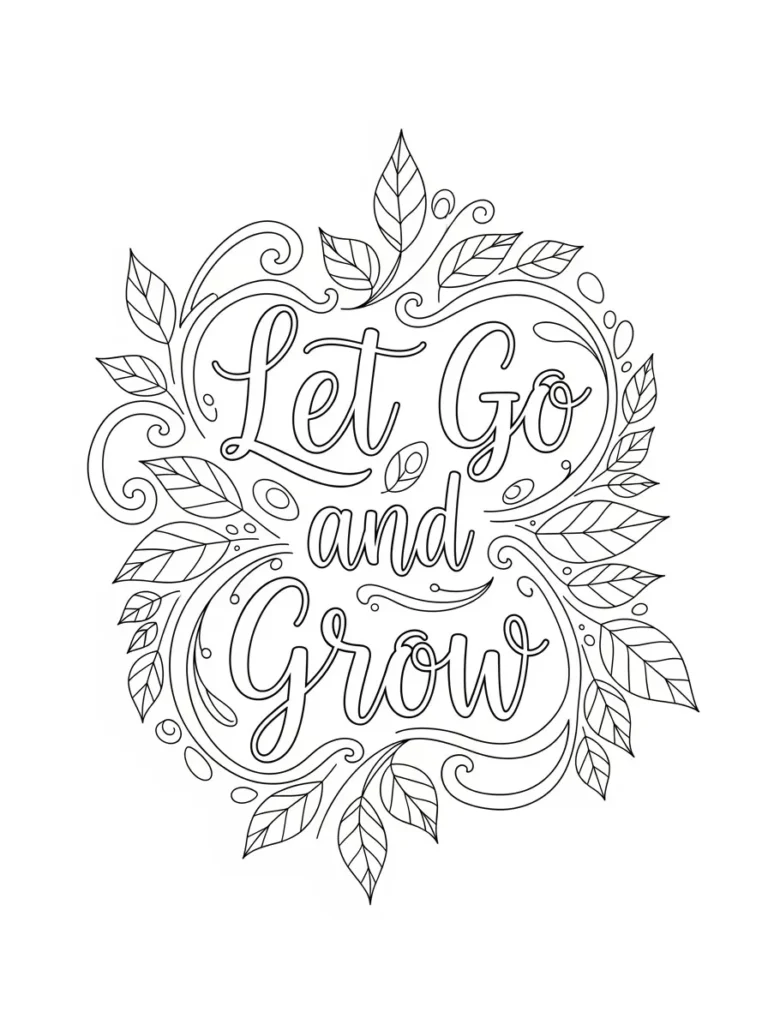 This adult coloring page features the uplifting phrase Let Go and Grow written in smooth flowing script, wrapped in a circular arrangement of leaves, curls, and gentle botanical accents. The design feels airy and organic, with leafy branches weaving around the words and soft swirl details filling the open spaces. The line work is clean and medium thin, giving the whole page a graceful look while still offering enough detail to enjoy slow careful coloring. The layout stays nicely balanced, keeping the quote centered while the nature inspired elements frame it beautifully.