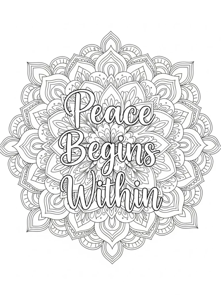 This adult coloring page features the calming quote Peace Begins Within placed at the center of an intricate mandala design. The mandala is filled with layered petal shapes, repeating patterns, and delicate line details that radiate outward in perfect symmetry. The lettering is bold enough to stand out while still blending beautifully into the surrounding shapes. Clean medium thin lines give the whole page a polished look and offer lots of small sections that make coloring feel satisfying and focused.
