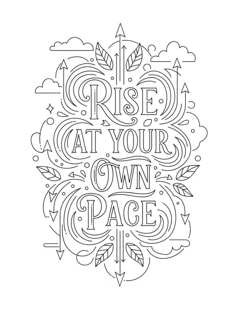 This adult coloring page features the encouraging phrase Rise At Your Own Pace arranged in stacked lettering, surrounded by flowing arrows, soft clouds, leafy accents, and swirling motion lines. The design feels energetic yet gentle, with arrows pointing upward to symbolize progress and growth without pressure. Clean medium thin lines keep everything crisp while offering plenty of open areas and smaller details to color. The vertical layout guides your eye naturally from top to bottom, making the message feel supportive and steady rather than rushed.