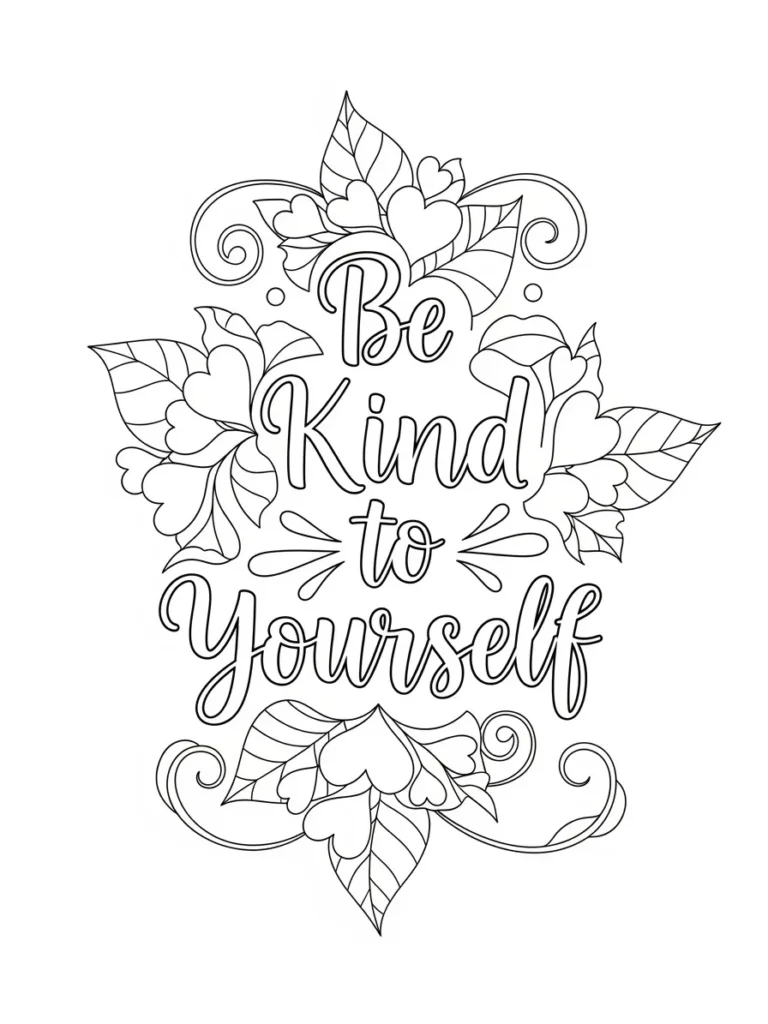 This adult coloring page features the heartfelt message Be Kind to Yourself in soft hand lettered script, surrounded by flowing leaves, heart shaped petals, and delicate curls. The design feels open and airy, with botanical elements arranged vertically to frame the quote without overpowering it. Clean medium thin lines give the page a graceful look while still leaving plenty of space for shading and blending. The hearts tucked into the leaves add a sweet touch that makes the whole layout feel warm and caring.