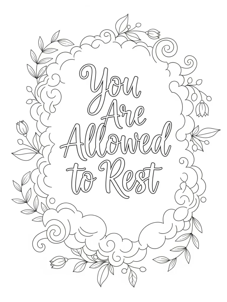 This adult coloring page features the comforting phrase You Are Allowed to Rest centered inside a soft cloud shaped frame. Flowing cloud lines create a cozy border, accented with delicate leaves, small buds, and gentle swirls that add movement without crowding the space. The lettering is smooth and rounded, with clean medium thin lines that keep everything easy to color. The overall layout feels open and soothing, with plenty of breathing room around the words and balanced botanical details around the edges.
