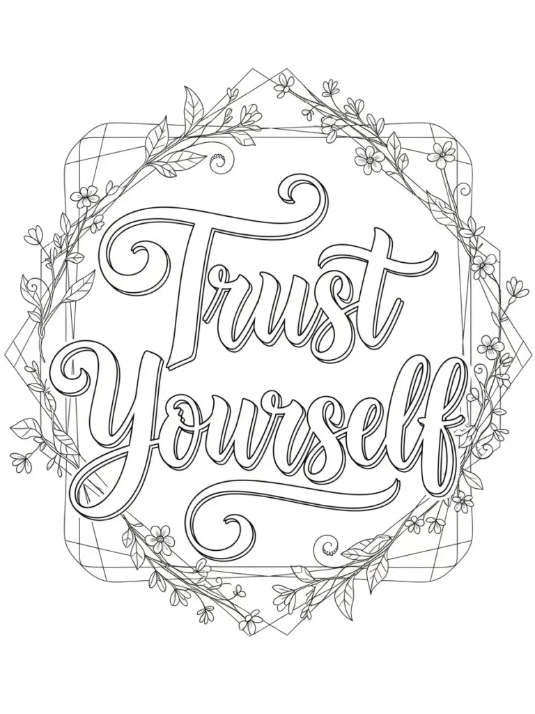 This adult coloring page showcases the empowering words Trust Yourself in flowing hand lettered script, centered inside a decorative frame filled with delicate florals and leafy vines. The frame has a soft geometric shape layered with organic details, giving the design a nice mix of structure and whimsy. Fine blossoms, curling stems, and subtle background lines add depth without overwhelming the quote. The line work is clean and medium thin, which makes the page feel elegant while still offering lots of satisfying spaces to color.