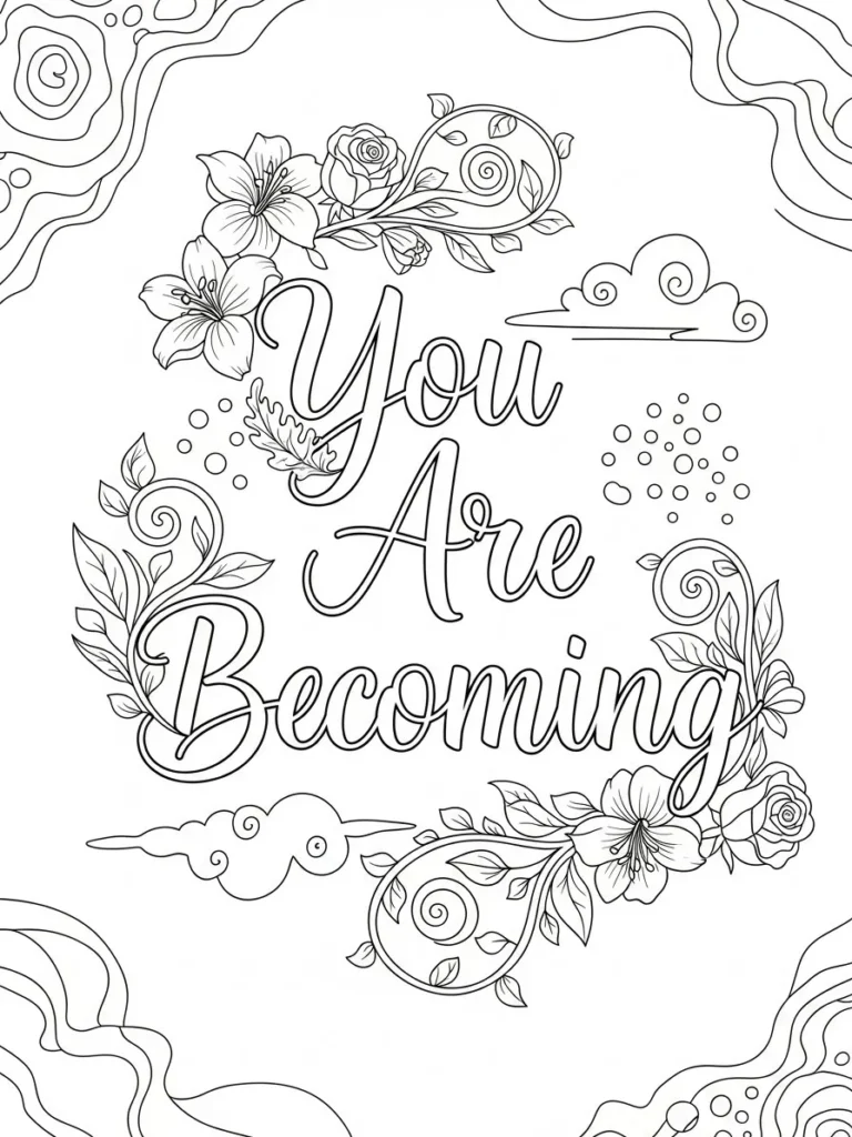 This adult coloring page features the inspiring words You Are Becoming written in flowing hand lettered script, surrounded by soft florals, curling vines, gentle clouds, and tiny dot accents. The layout feels open and dreamy, with the quote centered and framed by botanical details that float naturally around it. The line work is clean and medium thin, giving the flowers and swirls a light graceful feel while still offering plenty of space for careful coloring. The overall design feels balanced and airy, making the message stand out without feeling crowded.