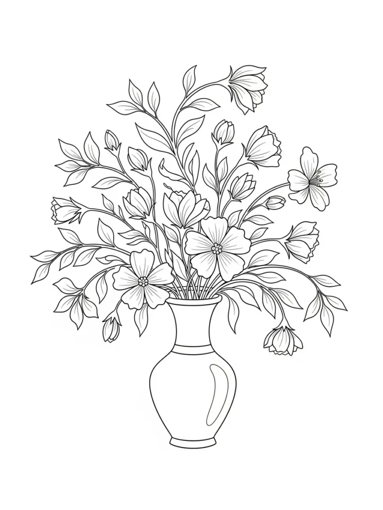 This coloring page features a tall elegant vase filled with a flowing bouquet of delicate flowers and leafy stems. The design feels airy and balanced with blossoms opening in different directions to create gentle movement across the page. The line work is clean and fine without being overwhelming, making each petal and leaf easy to follow while still offering plenty of detail. The open background gives the whole arrangement room to breathe, which adds to the calm and uncluttered feel of the layout.