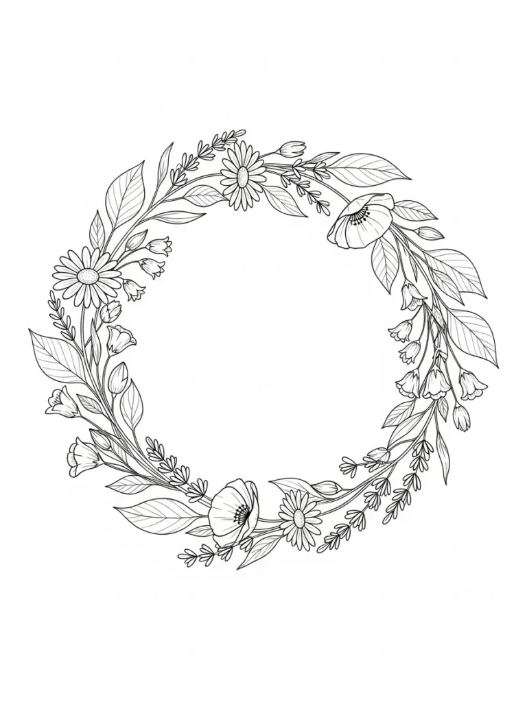 This coloring page features a soft circular wreath made of gentle flowers, leafy stems, and small budding details arranged in a graceful loop. Each floral element flows naturally into the next, creating a balanced and airy design with plenty of open space in the center. The line work is fine and elegant, offering just enough detail to stay interesting without feeling busy. The overall layout feels light and calming, perfect for slow and mindful coloring.
