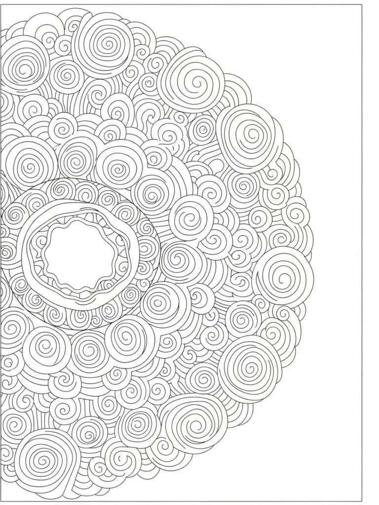 This coloring page features a bold circular mandala made up of layered spiral shapes that radiate outward from a softly framed center. Each swirl flows into the next, creating a rich textured pattern that feels rhythmic and continuous. The line work is clean and evenly spaced, with repeating curves that make the design feel structured without being stiff. The partial framing around the page adds a polished touch while keeping the focus on the calming circular motion.