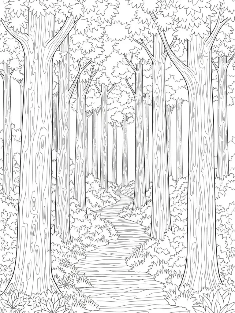 This coloring page shows a quiet forest with tall slender trees lining a gently winding path. The trunks are detailed with soft wood grain lines while leafy canopies create a calm layered look overhead. Bushes and small plants fill the forest floor, adding texture without feeling too busy. The line work is clean and consistent, giving plenty of space for shading and color blending while keeping the scene open and easy on the eyes.