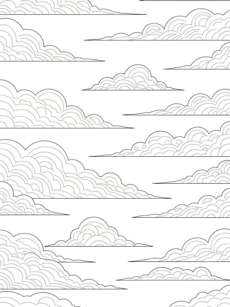 This coloring page is filled with rows of fluffy clouds drifting across an open sky. Each cloud is built from smooth repeating curves that layer gently on top of each other, creating a rhythmic and calming pattern. The lines are thin and consistent, giving the page a light airy feel without heavy detail. The layout feels spacious and balanced, making it easy to focus on one cloud at a time or treat the whole page like a soothing pattern play.
