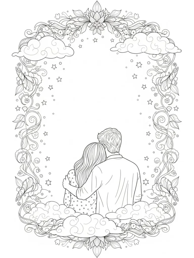 I love coloring pages like this because they feel calm and emotional without being overwhelming. Coloring the clouds and stars always puts me in a relaxed headspace, and adding soft tones to the florals feels almost meditative. This one makes me think about quiet moments and shared comfort, which somehow makes the coloring experience feel even cozier. It is the kind of page I reach for when I want something soothing, romantic, and a little bit magical all at once.