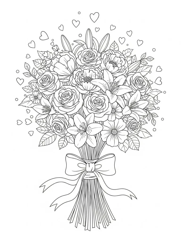 This romantic adult coloring page features a full floral bouquet tied with a flowing ribbon, overflowing with roses, lilies, and soft layered blooms. Tiny hearts float gently around the flowers, adding a playful and loving touch to the design. The line work is clean and detailed, with fine petal textures, delicate leaves, and graceful stems that come together in a balanced and rounded arrangement. The bow at the base anchors the bouquet beautifully, giving the whole page a classic and heartfelt feel.