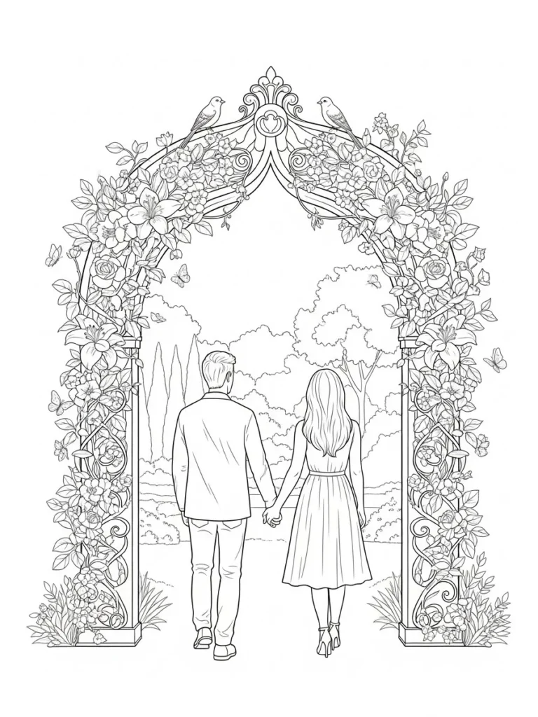 This romantic adult coloring page shows a couple walking away together beneath an ornate garden arch overflowing with flowers, leaves, and delicate vines. Birds rest at the top of the arch while butterflies flutter around the floral frame, adding a soft and whimsical touch. The line work is fine and detailed in the flowers and foliage, balanced by simpler lines in the figures and the open landscape beyond. The layout feels like an inviting doorway, with the couple centered and the lush arch creating a beautiful sense of depth and movement.