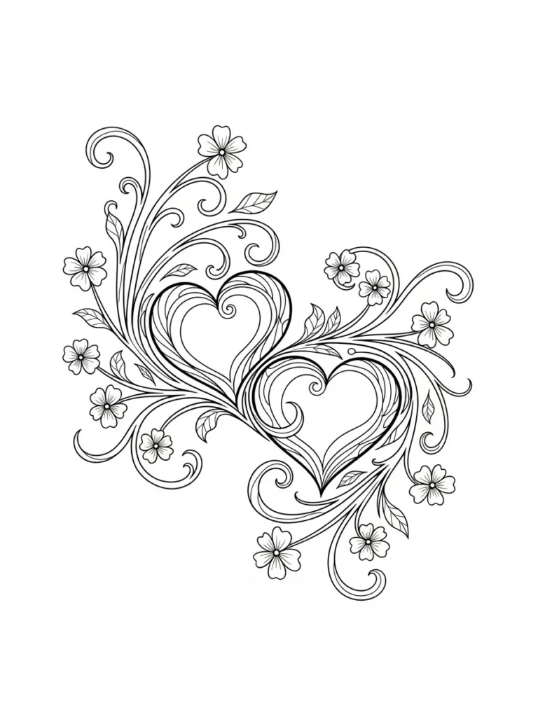This romantic adult coloring page features two intertwined hearts formed from flowing lines, curling vines, and small blooming flowers. The design feels light and graceful, with sweeping curves that move naturally across the page and delicate petals tucked into the swirls. The line work is fine and elegant, giving just enough detail to stay interesting while leaving plenty of open space for creative color choices. The overall layout feels airy and balanced, like love drifting gently through motion and shape.