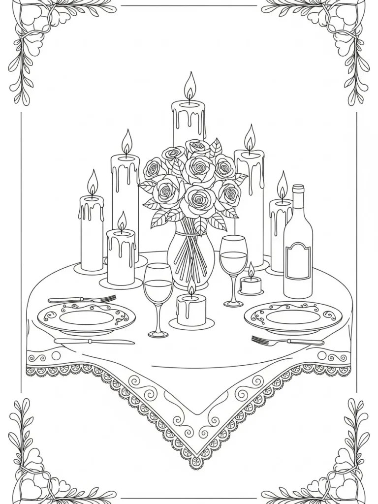 This romantic adult coloring page shows an elegant dinner table arranged for a cozy evening, complete with glowing candles, a bouquet of roses, wine glasses, and softly detailed place settings. The tablecloth drapes gently with decorative edges and subtle patterns that add texture without overwhelming the scene. The line work is clean and graceful, with a lovely balance between detailed elements like the florals and candles and simpler shapes like the plates and glasses. A delicate border frames the page, giving it a finished and intimate feel.