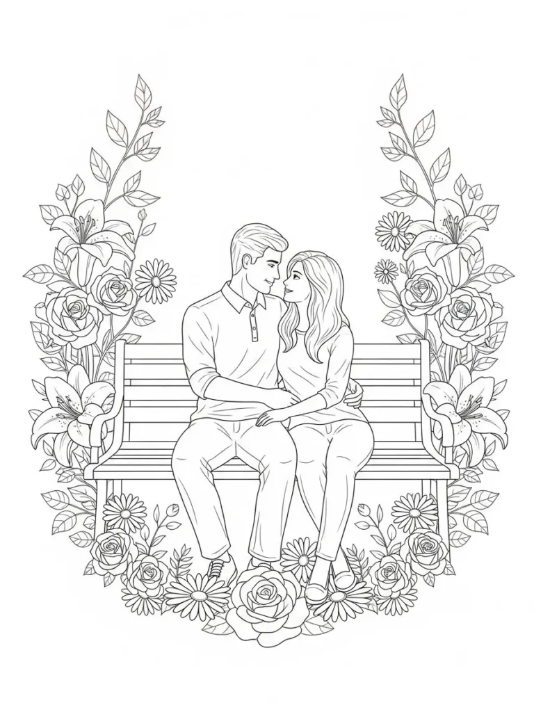 This romantic adult coloring page shows a couple sitting close together on a park bench, surrounded by blooming flowers and leafy stems that rise on both sides like a natural frame. Roses, daisies, and lilies fill the scene with soft floral detail, while the bench and figures are drawn with clean, simple lines that keep the focus on their connection. The composition feels balanced and open, with the couple at the center and the florals creating a gentle sense of enclosure around them.