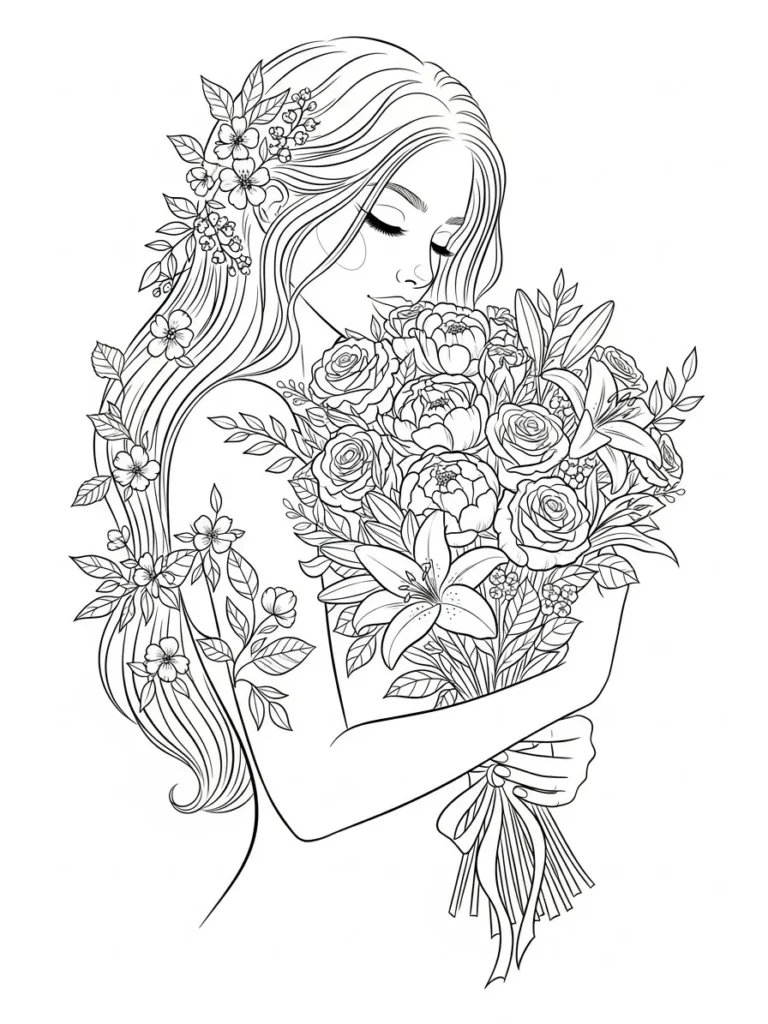 This romantic adult coloring page features a serene woman gently holding a lush bouquet of flowers close to her heart. Flowing hair cascades down her shoulder and blends beautifully with delicate blossoms, leaves, and small floral accents woven throughout the design. Roses and lilies fill the bouquet with layered petals and fine details, while the lines stay elegant and smooth across the face and figure. The overall layout feels soft and graceful, with a natural balance between detailed florals and open space that keeps the page light and inviting.