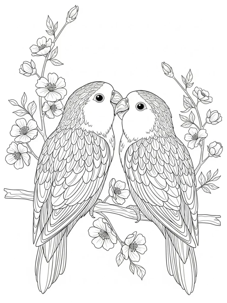 This romantic adult coloring page features two sweet birds perched closely together on a branch, their beaks gently touching as if sharing a tender kiss. Delicate blossoms and leafy stems rise on both sides, framing the birds in a soft floral setting. The feather details are finely drawn with layered lines that add texture and depth, while the flowers keep the design light and graceful. The layout feels balanced and intimate, with the birds as the clear focal point and plenty of open space to let the details shine.