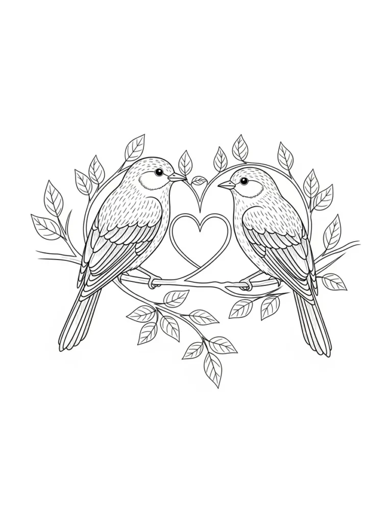 This romantic adult coloring page features two sweet birds facing each other on a gently curved branch, with their bodies framed by leafy vines and a simple heart floating between them. The line work is clean and refined, with soft feather textures and delicate leaf details that add interest without feeling too busy. The layout is beautifully balanced and symmetrical, giving the design a calm and harmonious feel that is easy on the eyes.