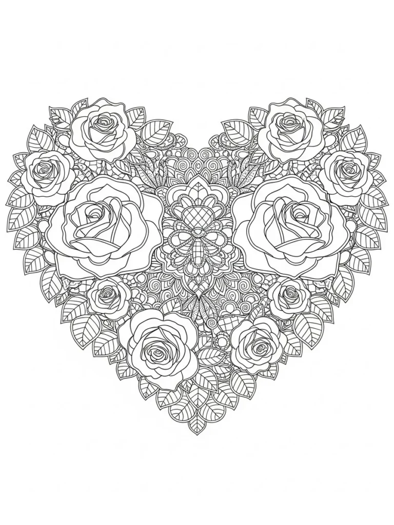 This romantic adult coloring page features a heart shape built entirely from blooming roses, layered leaves, and intricate ornamental patterns. The design is symmetrical and full, with a decorative center that adds a lace like feel surrounded by soft floral shapes. The line work is fine and detailed, especially in the petals and background patterns, while the heart outline keeps everything feeling cohesive and balanced. It has that classic romantic look that feels rich without being overwhelming.