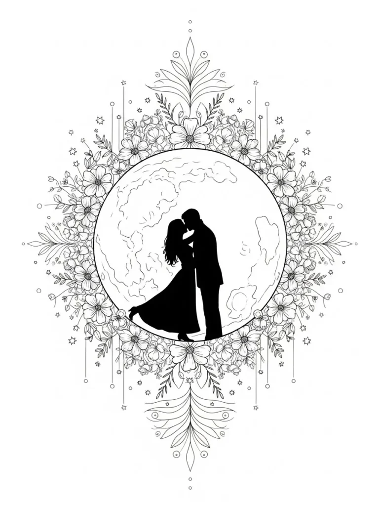 This romantic adult coloring page shows a silhouetted couple sharing a kiss in front of a glowing moon, surrounded by an ornate arrangement of flowers, leaves, and tiny star details. The strong contrast between the solid black figures and the fine floral line work creates a beautiful balance between bold and delicate. Symmetry plays a big role in the design, with floral clusters and decorative elements radiating outward from the moon. The lines are crisp and detailed around the flowers while the center stays simple and striking.