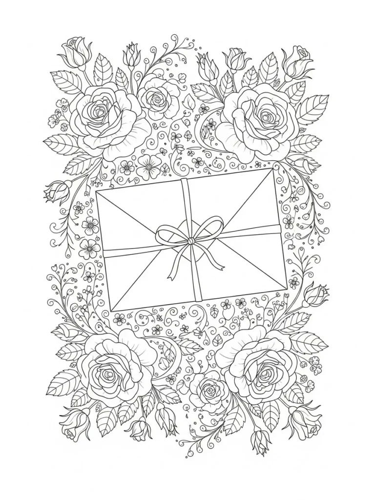 This romantic adult coloring page features a sealed envelope tied with a ribbon, nestled inside a lush frame of blooming roses, buds, leaves, and swirling vines. The composition feels full and balanced, with the envelope centered and the florals gently wrapping around it like a loving embrace. Fine line work adds beautiful detail to the petals and foliage, while the envelope itself stays clean and simple, creating a lovely contrast. The overall layout feels thoughtful and sentimental, with every curve guiding the eye back to the heart of the design.