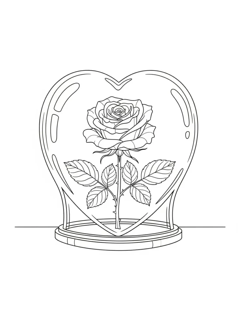 This romantic adult coloring page features a single rose standing tall inside a heart shaped glass dome, resting on a simple base. The rose is detailed with layered petals and textured leaves, while the smooth heart outline creates a soft and elegant frame around it. The line work is clean and slightly varied, giving definition to the flower while keeping the glass dome simple and open. The layout feels centered and balanced, with plenty of breathing room that makes the design feel timeless and romantic.