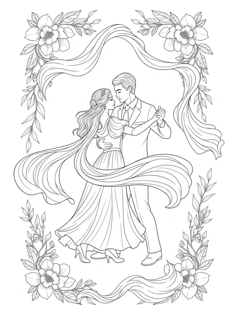 This romantic adult coloring page captures a couple sharing a graceful dance, wrapped in flowing ribbons of fabric and surrounded by blooming florals and leafy details. The line art is elegant and fluid, with soft curves in the dress and sweeping motion lines that create a sense of movement. Floral clusters frame the scene at the top and bottom, giving the design a balanced and dreamy layout. The lines are fine and refined, offering plenty of space for shading while still feeling detailed and expressive.
