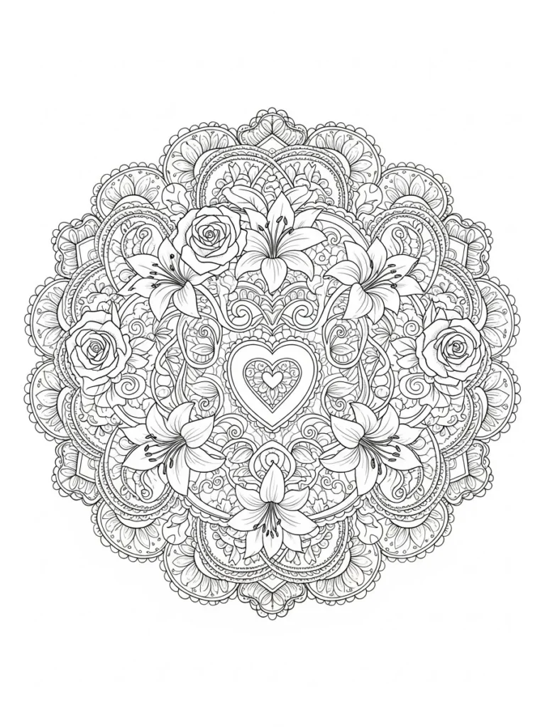 This romantic adult coloring page features an intricate mandala built around a central heart, surrounded by layered florals, swirling petals, and ornamental patterns. Roses and lily style blooms repeat symmetrically, creating a rich circular design that feels full and balanced. The line work is fine and detailed, with lots of small sections that invite careful coloring while still keeping the overall shape soft and elegant. Every curve and petal flows naturally into the next, making the layout feel harmonious and intentional.