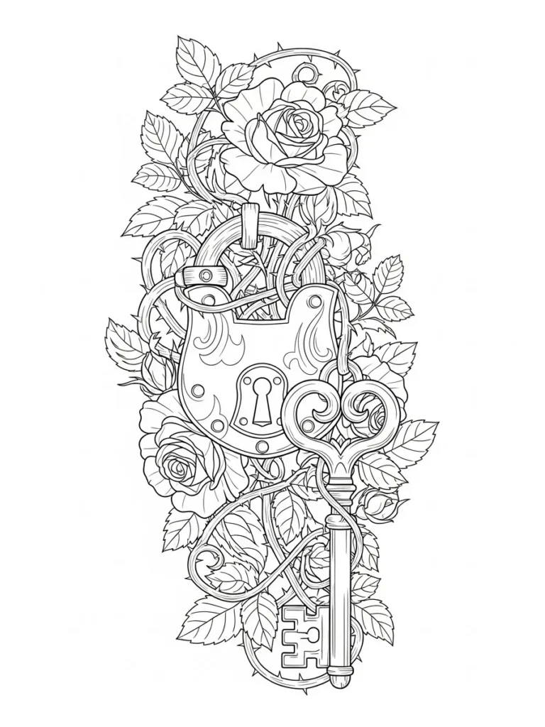 Some people love coloring designs that feel symbolic, and this one really does it for me. I enjoy slowly shading the roses and deciding how bold or soft the lock should look. Coloring the vines feels relaxing, almost like following a gentle path with my pencils. This page feels romantic in a deep and meaningful way, and I always finish it feeling calm, focused, and a little swept up in the story it tells.