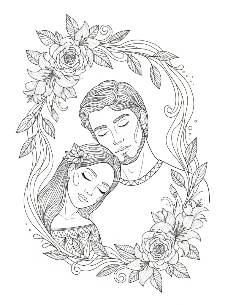 This romantic adult coloring page shows a peaceful couple resting close together, with soft expressions and closed eyes that radiate calm and trust. Flowing hair, delicate facial lines, and gentle patterns in their clothing create a tender focal point, while an oval frame of flowers, leaves, and curling vines surrounds them. Roses and lilies bloom around the edges, and the fine line work keeps everything detailed yet soothing. The overall layout feels balanced and intimate, with natural curves guiding your eye through the design.