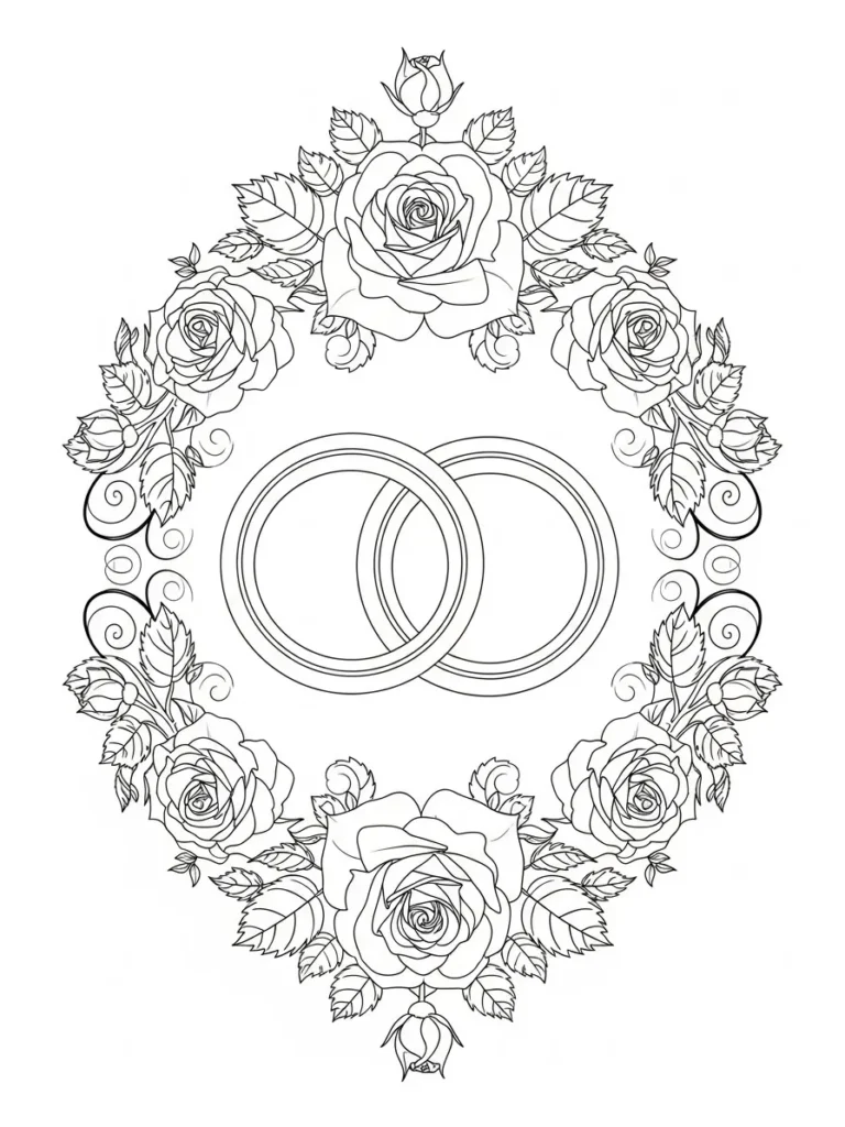 This romantic adult coloring page features two interlocking rings at the center, surrounded by a lush circular wreath of roses, buds, leaves, and soft swirling accents. The floral arrangement is symmetrical and full, creating a balanced frame that feels elegant and timeless. The line work is clean and refined, with detailed petals and layered leaves that add depth while keeping the rings smooth and simple. The overall layout feels classic and meaningful, with plenty of space to play with color and shading.