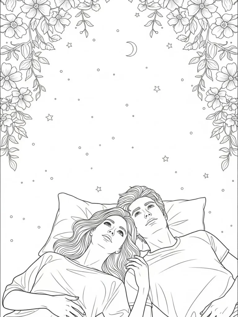 This romantic adult coloring page shows a couple lying side by side, gazing upward beneath a quiet night sky filled with tiny stars and a gentle crescent moon. Floral vines and blossoms cascade from the top corners, framing the scene like a soft canopy. The line work is clean and expressive, with detailed hair strands, relaxed facial features, and flowing fabric folds that feel natural and unforced. The open space around the stars keeps the layout airy, while the floral border adds just enough detail to make the page feel special.