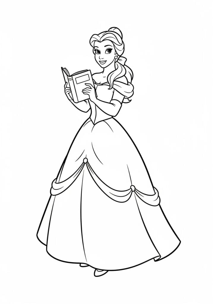 This coloring page shows Belle from Beauty and the Beast in a full-length pose, holding an open book in her hands with the most content little smile on her face, because of course she has a book. Her gorgeous ball gown fills the bottom two thirds of the page with a really beautiful silhouette, featuring that distinctive layered skirt with the draped overskirt detail and small button-like accents that make her dress so recognizable. Her warm golden hair is loosely tied back with a ribbon and cascades over one shoulder, adding a lovely soft touch to the upper half of the design. The linework is smooth and flowing throughout, with elegant curves that really capture the graceful movement of her gown.