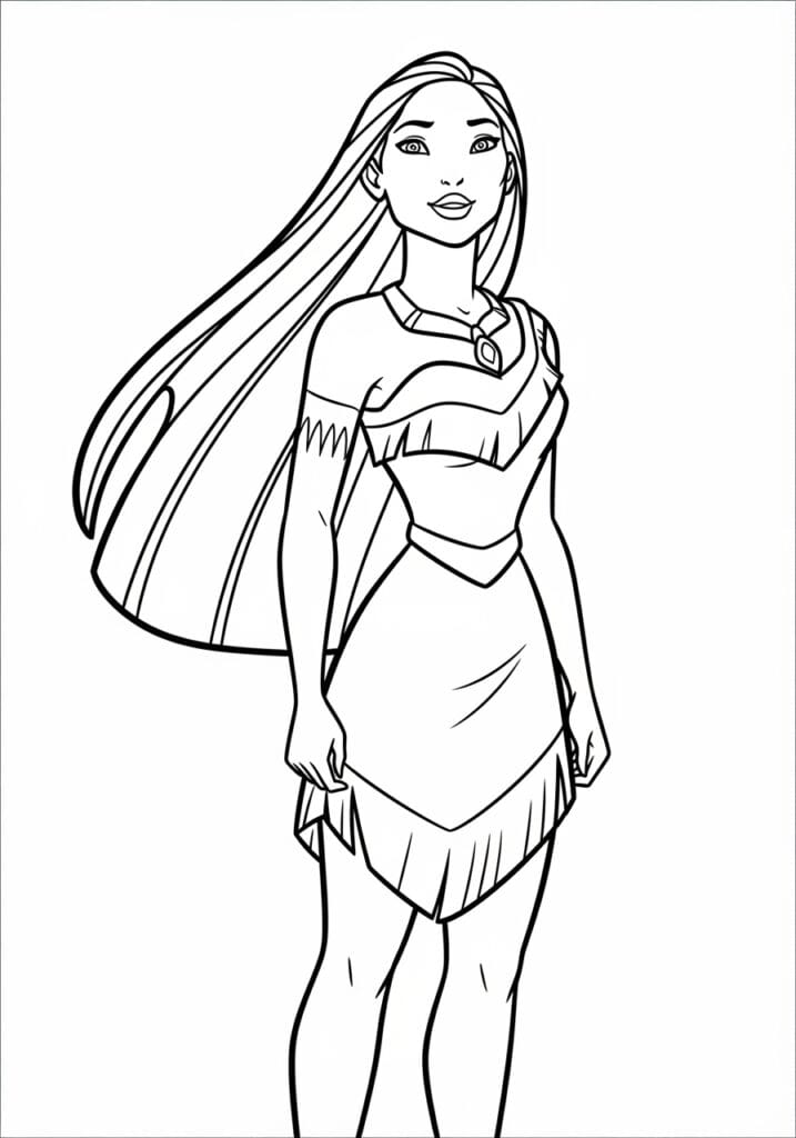 This coloring page shows Pocahontas in a full-length standing pose, and the absolute showstopper of the design is her incredible long hair sweeping dramatically out to the left side of the page as if caught in a strong breeze. The hair takes up nearly a third of the total design and is rendered with beautiful flowing lines that give it incredible movement and life. Her fringed dress features lovely zigzag trim details along the neckline and hem, and a pretty pendant necklace sits at her collarbone adding a delicate focal point to her upper body. The linework throughout is elegant and confident, with long smooth strokes that really capture her graceful and free-spirited personality.