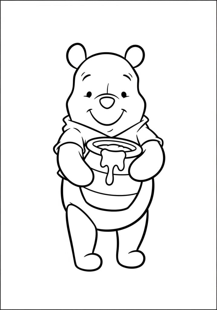 This coloring page features the most wholesome little bear in all of the Hundred Acre Wood, standing front and center while cradling his beloved honey pot with both paws. Pooh’s round, soft body takes up most of the page and his tiny crop top shirt adds that classic touch we all know and love. The honey pot is a really sweet focal point, with drips of honey running down the sides that look almost good enough to eat. The linework is bold and smooth throughout, keeping everything clean and approachable, and the simple bordered layout gives the whole design a really neat and tidy feel.