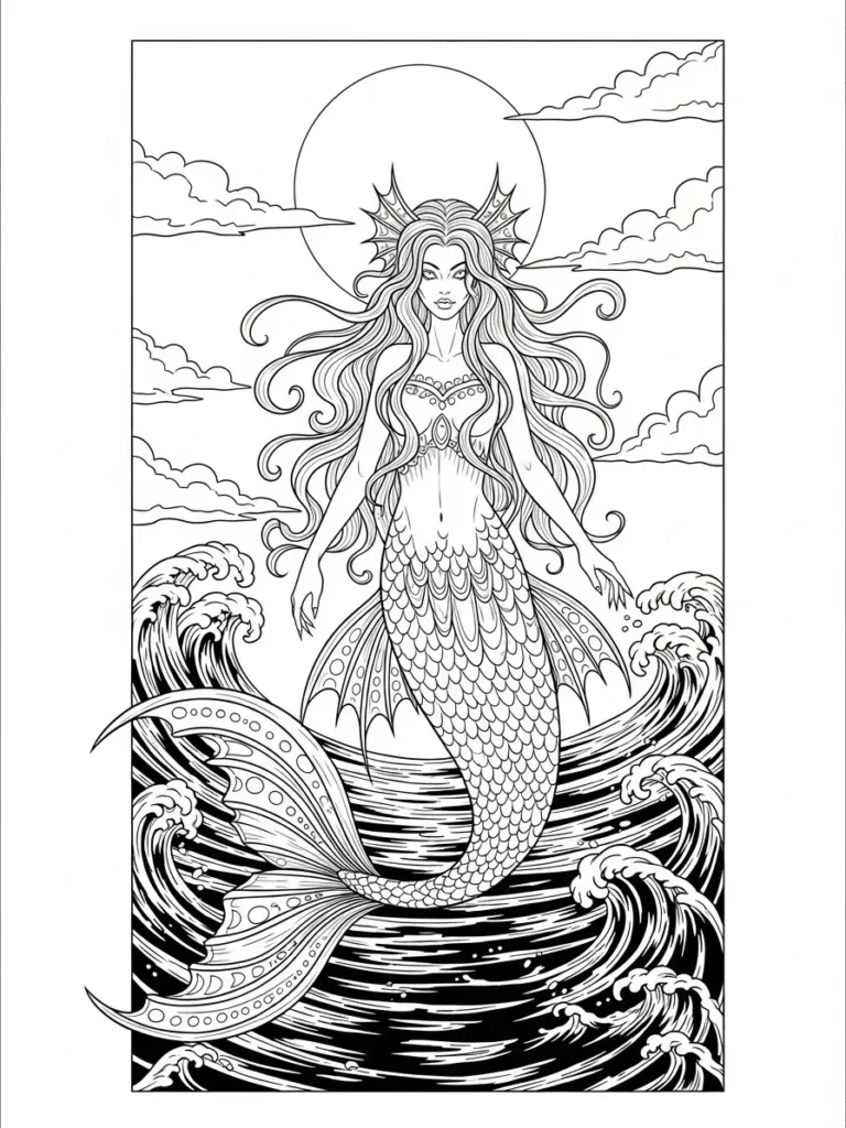 If you’re into dramatic fantasy scenes, this one is so satisfying to color. I love playing with deep ocean tones in the waves and then adding softer shades to her hair and scales for contrast. Coloring the movement in the water feels almost meditative and keeps my hands busy in the best way. This page always puts me in a creative flow and feels like telling a spooky sea story through color.