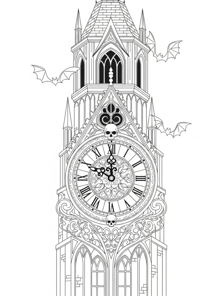 This coloring page features a tall gothic clock tower rising straight up the page with dramatic symmetry and elegant architectural details. The large clock face sits at the center, filled with swirling ornamental patterns, Roman numerals, and sharp clock hands that draw the eye in. Skulls are tucked into the design above and below the clock, adding a spooky twist, while small bats flutter around the tower to give it movement. Clean fine lines and repeating shapes make the structure feel bold yet calming, with plenty of open areas to balance the detailed sections.