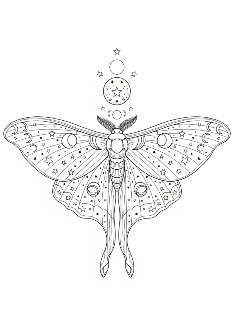 This coloring page features a beautifully symmetrical moth with wide flowing wings filled with stars, moons, and delicate cosmic patterns. The body is centered and elongated, with fine line details that guide your eye upward toward a vertical row of celestial symbols floating above. Clean thin lines outline the wings, while repeating dots, curves, and star shapes create a dreamy balance between structure and softness. The open background keeps the focus on the moth itself, making the whole design feel elegant, mysterious, and lightly spooky.