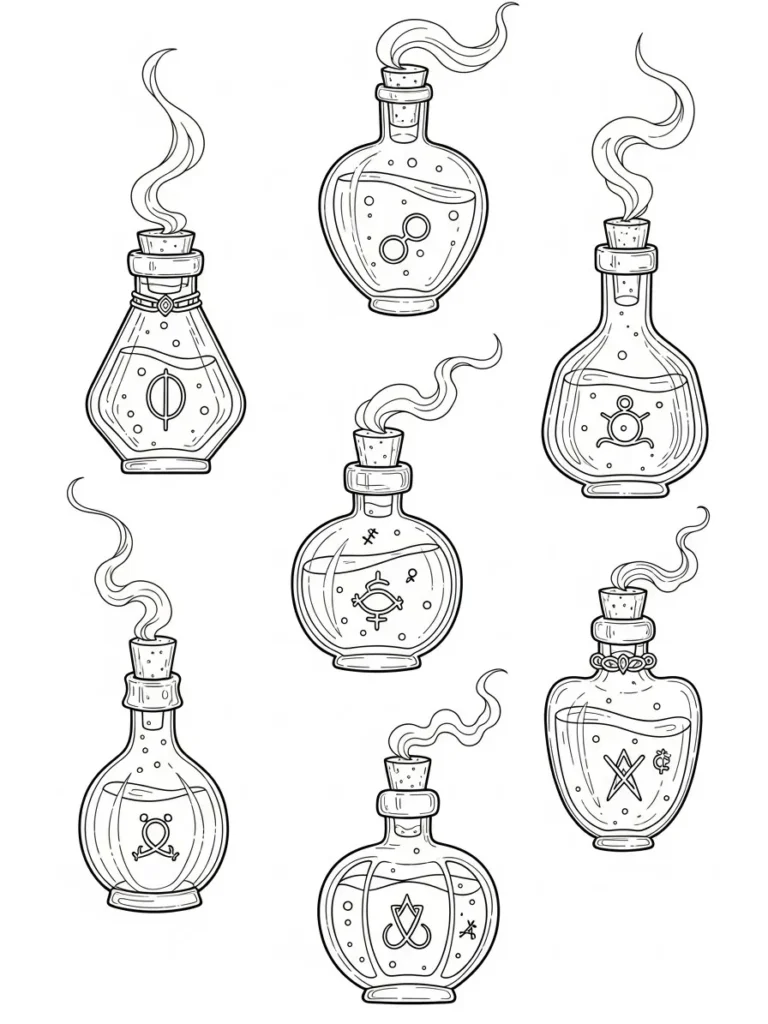 Some people love detailed scenes, but I really enjoy pages like this when I want something relaxing and low pressure. I like choosing different color schemes for each bottle and imagining what kind of magic they might hold. Coloring the soft smoke shapes is surprisingly calming and lets me loosen up creatively. This page is perfect for cozy coloring sessions when I want spooky vibes without a lot of intense detail.