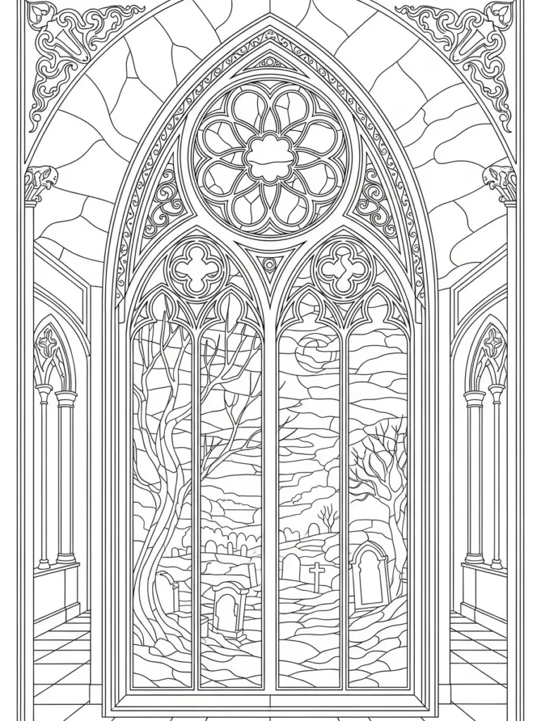 This coloring page features a tall ornate gothic window framed by arches, columns, and decorative stone details. The stained glass style panes reveal a quiet graveyard scene outside, complete with winding hills, bare trees, and simple gravestones resting beneath a cloudy sky. Intricate patterns fill the window tracery and surrounding architecture, while fine clean lines keep everything crisp and elegant. The symmetrical layout and layered details create depth without feeling overwhelming, making the whole scene feel haunting yet peaceful.