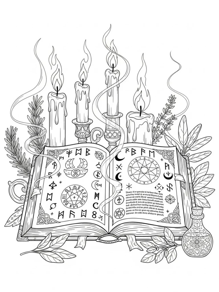 This coloring page features an open spellbook resting on a table, filled with magical symbols, runes, and circular diagrams. Tall dripping candles rise behind the book, their flames twisting upward in soft flowing lines that add movement to the scene. Surrounding details like leafy herbs, potion bottles, and small decorative elements give the design a cozy witchy feel. The line work is fine and detailed, with a nice mix of open spaces and intricate sections that make the layout feel rich without being overwhelming.