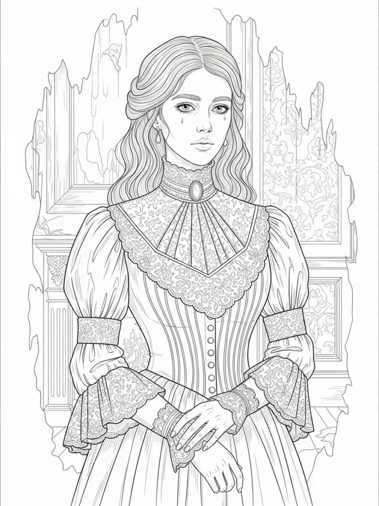 This coloring page features a beautifully detailed Victorian style woman standing in front of an aged interior backdrop. Her flowing dress is filled with lace patterns, buttons, and soft folds that create plenty of texture and depth. Fine line work defines her calm expression, delicate jewelry, and carefully styled hair, while subtle cracks and worn edges in the background hint at a quiet haunting atmosphere. The overall layout feels balanced and elegant, with the figure centered and framed by architectural details that add mood without overpowering the scene.