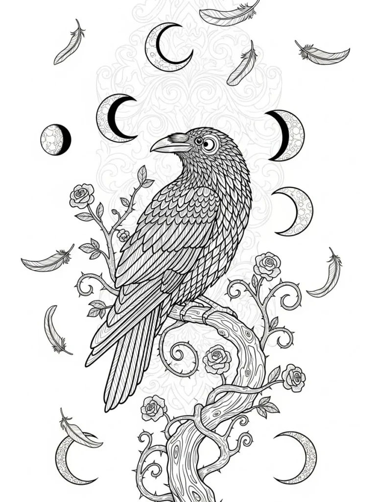 This coloring page features a beautifully detailed raven perched on a twisting branch wrapped with blooming roses and curling vines. The feathers are layered with fine line patterns that give the bird a rich textured look, while crescent moons and moon phases float around it in a soft circular rhythm. Scattered feathers and subtle ornamental swirls in the background add movement without crowding the design. The clean line work and balanced composition make the page feel mystical, elegant, and gently spooky.